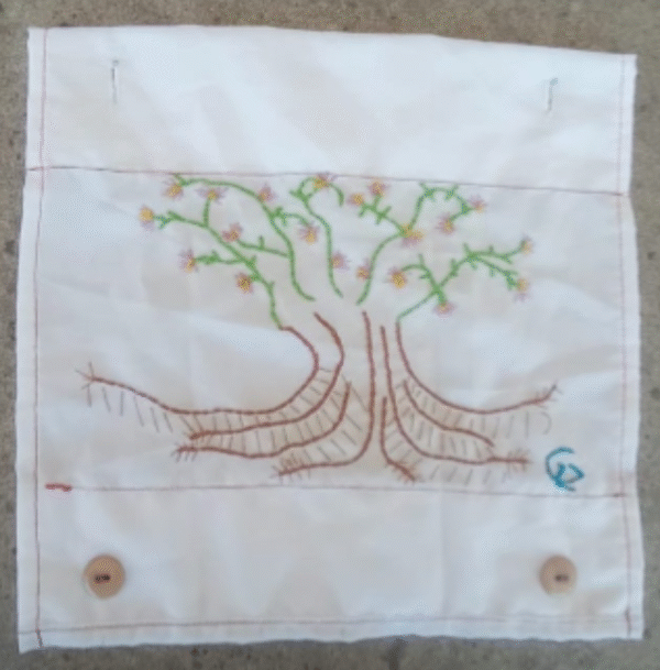 En el bordado quise mostrar un árbol que se considera sagrado: el maíz, con sus hojas grandes y en floración. Tiene elementos muy definidos, un ave y una mujer con un atuendo de jaguar.